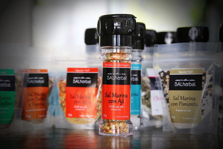 Mezcla de cristales de sal marina con ají rocoto y especias andinas deshidratadas / Blend of coarse pacific sea salt and dried andean chili and herbs.